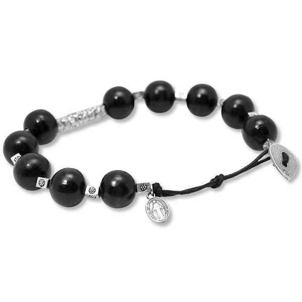 Bracciale Decina Rosario perle in legno nero, Medaglia Miracolosa